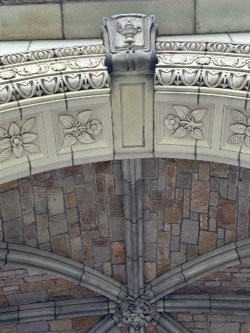 This image showcases a decorative stone archway adorned with intricate carvings, set against the textured backdrop of a stone wall. The detailed craftsmanship highlights the architectural artistry characteristic of the University of Michigan Law Quad, providing an expert study in historic masonry and ornamental design.