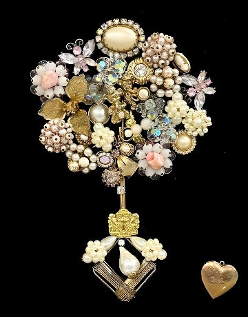 This vintage-style jewelry art piece showcases a sophisticated arrangement of pearls and crystals set against a striking black background. Expertly crafted, it combines classic elegance with timeless charm, making it an exquisite accent for any collection or décor.