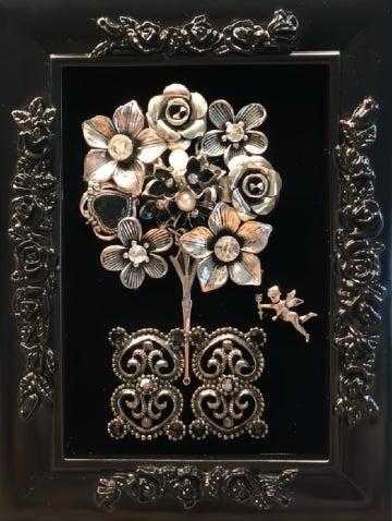 This vintage jewelry art piece features a bold silver floral design intertwined with a cherub motif, set against a deep black background. The contrasting elements emphasize the intricate craftsmanship and timeless elegance, making it a distinguished item that embodies both artistry and classic beauty.