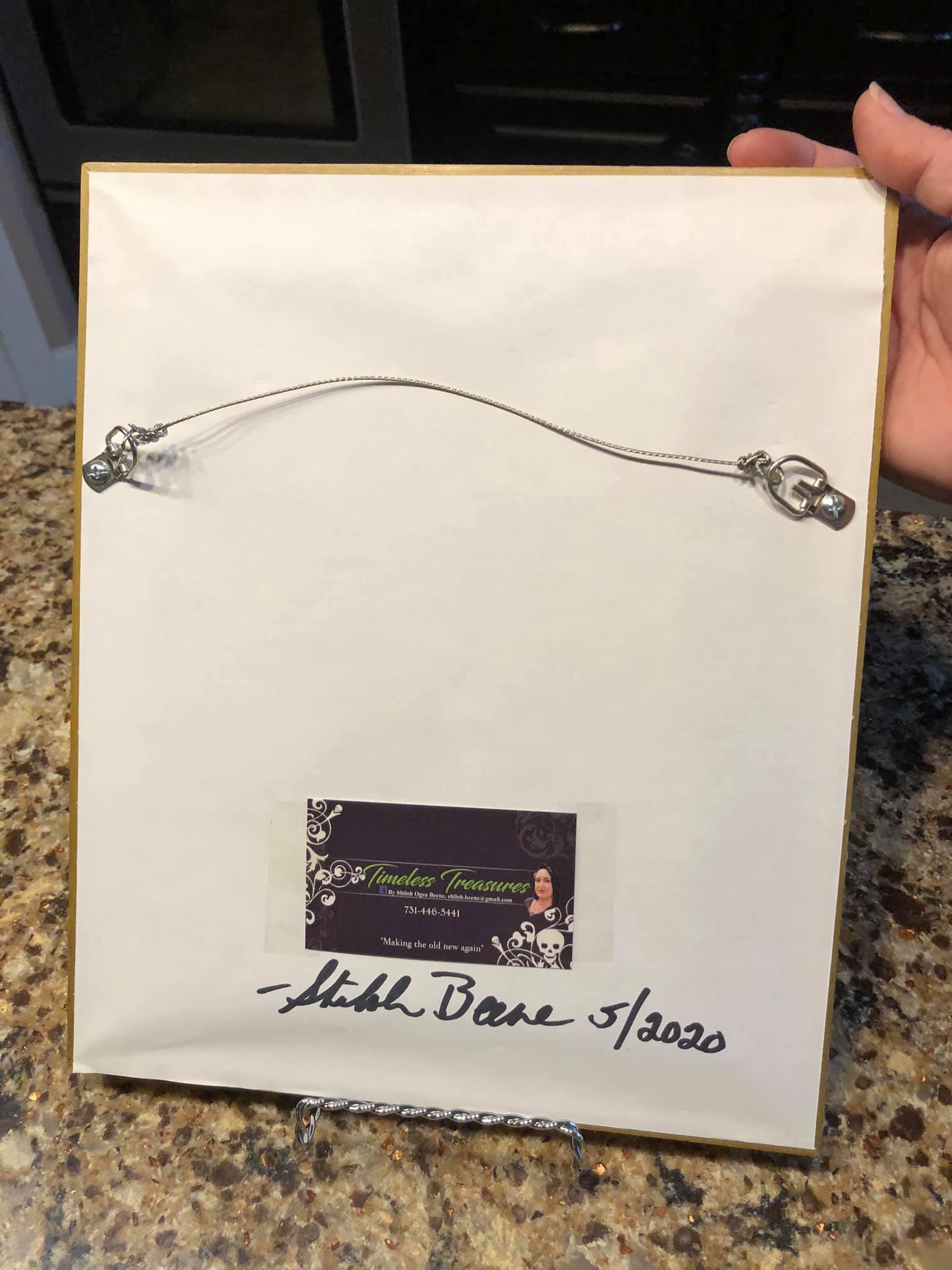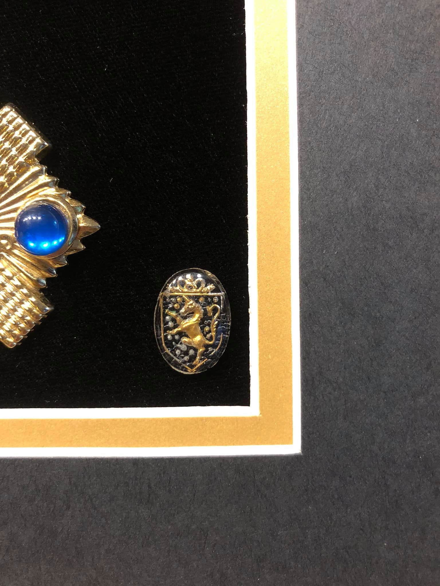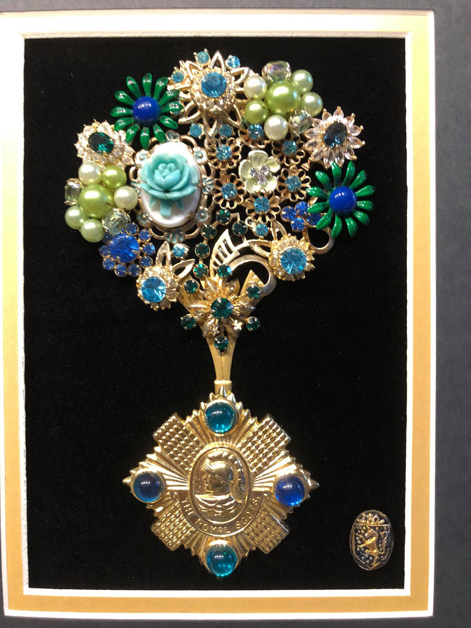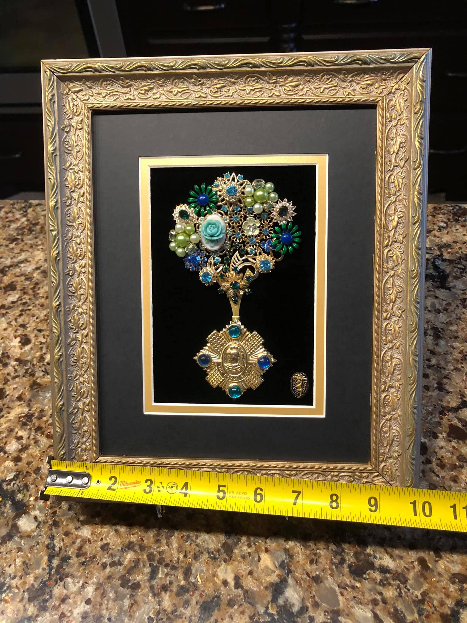"Blue Royalty," an 8x10 decorative art piece, features a refined floral motif crafted from vintage jewelry, artfully arranged with rhinestone and golden jewelry on a velvet background. Encased in an elegant gold frame, it offers a sophisticated blend of texture and shimmer, perfect for adding timeless charm to any space.