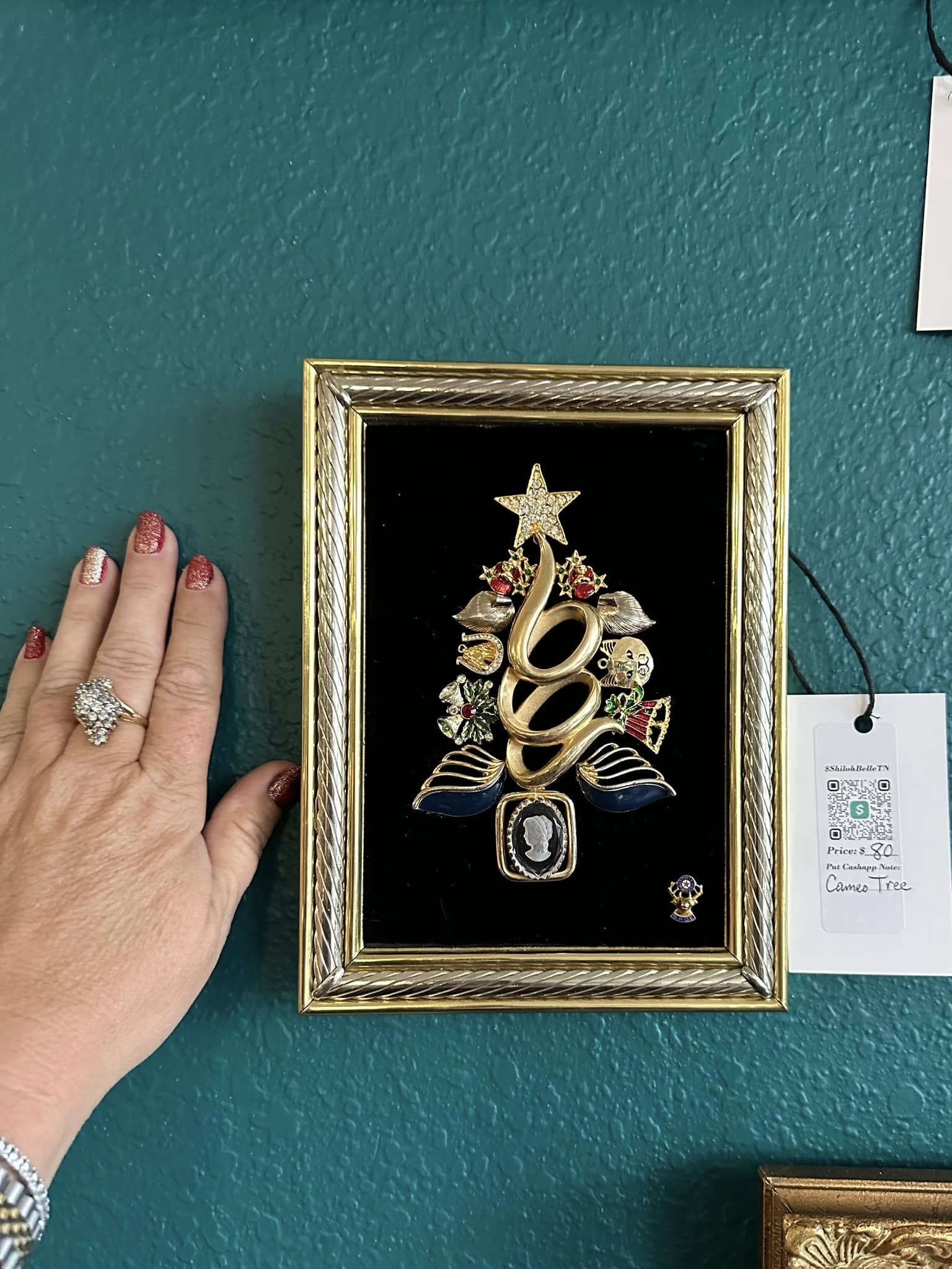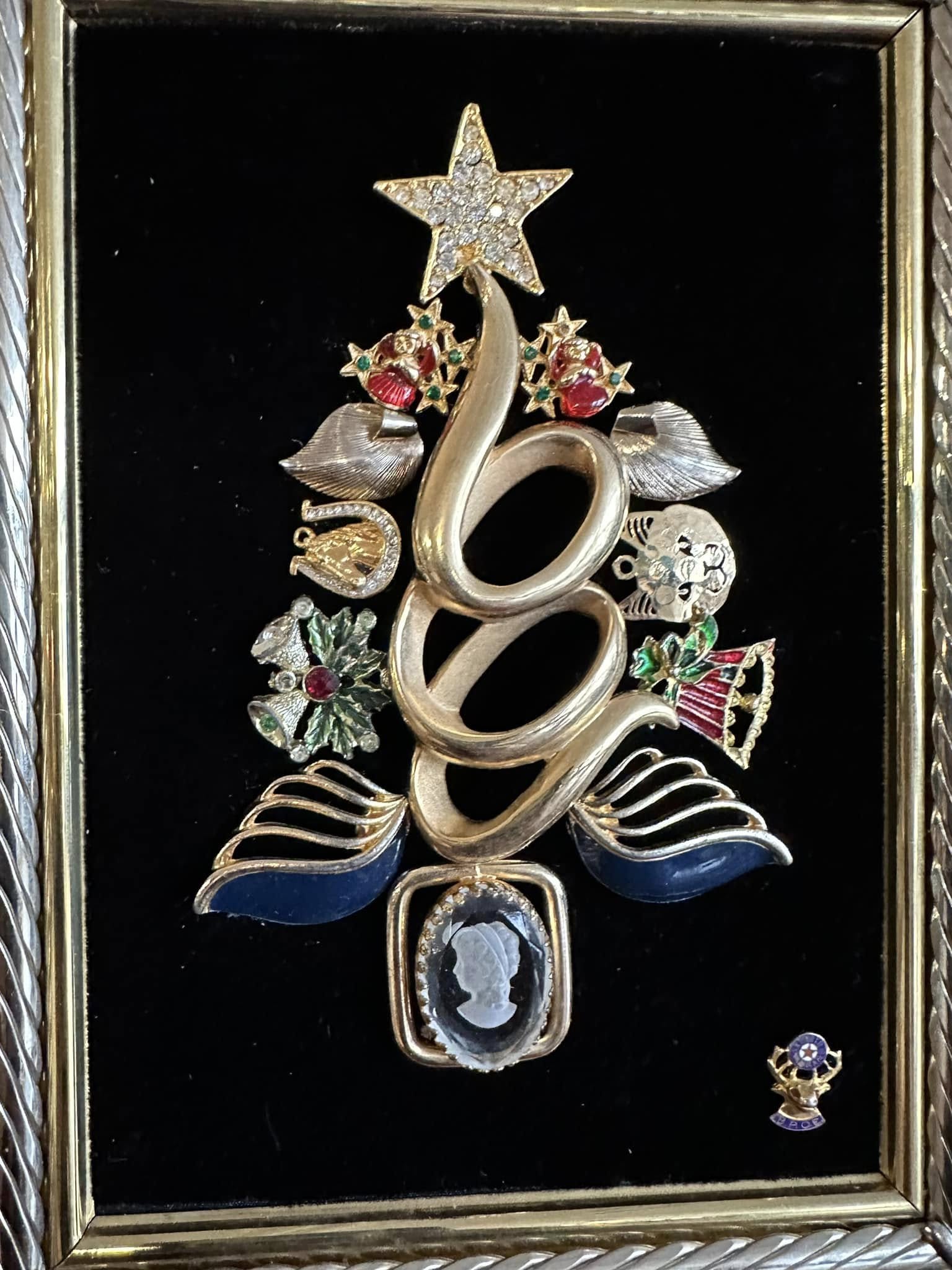 The 5x7 "Cameo Christmas Tree" is a distinctive art piece showcasing a Christmas tree design meticulously assembled from vintage jewelry on a velvet background. Framed in a unique combination of silver and gold, it combines classic elegance with holiday spirit, making it an exceptional decorative accent for the festive season.