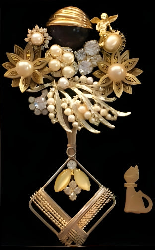 "Cat's Eye" is a vintage jewelry art piece crafted from golden jewelry elements set against a black background. The radiant gold tones create a captivating contrast, highlighting the intricate design and meticulous craftsmanship.