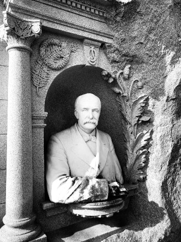 This black and white photograph captures a marble statue of a man dressed in a formal suit, set within an ornate stone niche. The monochrome palette emphasizes the statue’s refined details and the architectural elegance of its surroundings. This artwork conveys a timeless respect and solemnity, making it a distinguished element for cemetery memorials.