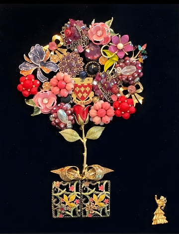 "Color Pop" is a vintage jewelry art piece composed of vibrant, multicolored jewelry elements set against a black background. The vivid hues contrast strikingly with the dark backdrop, accentuating the intricate craftsmanship and dynamic composition. This piece exemplifies expert artistry and timeless vintage charm, offering a bold and captivating addition for discerning collectors.