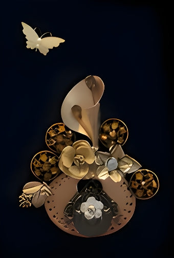 "Golden Pond" is a vintage jewelry art piece crafted exclusively from gold jewelry elements set against a black background. This artwork embodies classic elegance and timeless sophistication, making it a remarkable addition for collectors who appreciate refined vintage artistry.