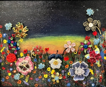 This artwork combines vibrant floral elements with vintage jewelry accents, set against a striking backdrop that transitions from a warm sunset to a starry night sky. The composition showcases expert attention to detail, blending color and texture to create a captivating scene that highlights both natural beauty and classic elegance, perfect for discerning collectors and art enthusiasts.