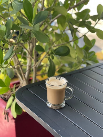 Key West 3 depicts a small glass of coffee resting on a sleek black table, set against a backdrop of vibrant green foliage, offering a refined visual that balances simplicity with an inviting ambiance. Ideal for connoisseurs who appreciate thoughtful presentation. To this day, it was the best cup of coffee I have had in my life.