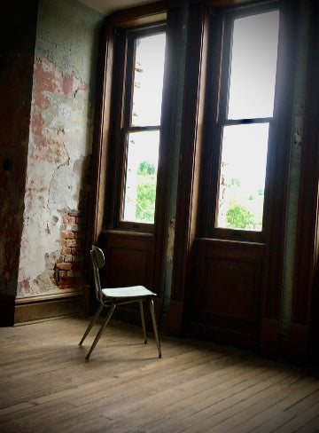 This image captures a solitary chair set within a room at Mansfield Prison, framed by large windows that cast natural light over peeling paint on walls. The composition reveals textures of aged surfaces and a quiet atmosphere, offering an expert perspective on historic interiors marked by time and decay.