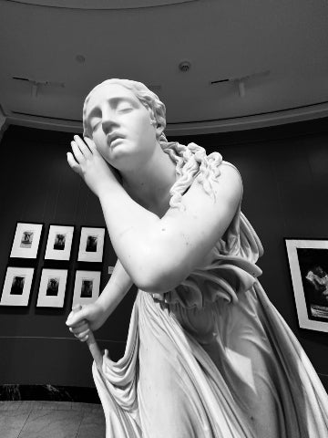 This marble statue of a classical woman, showcased in a museum setting with framed pictures on the wall, embodies sculptural elegance and artistic tradition.