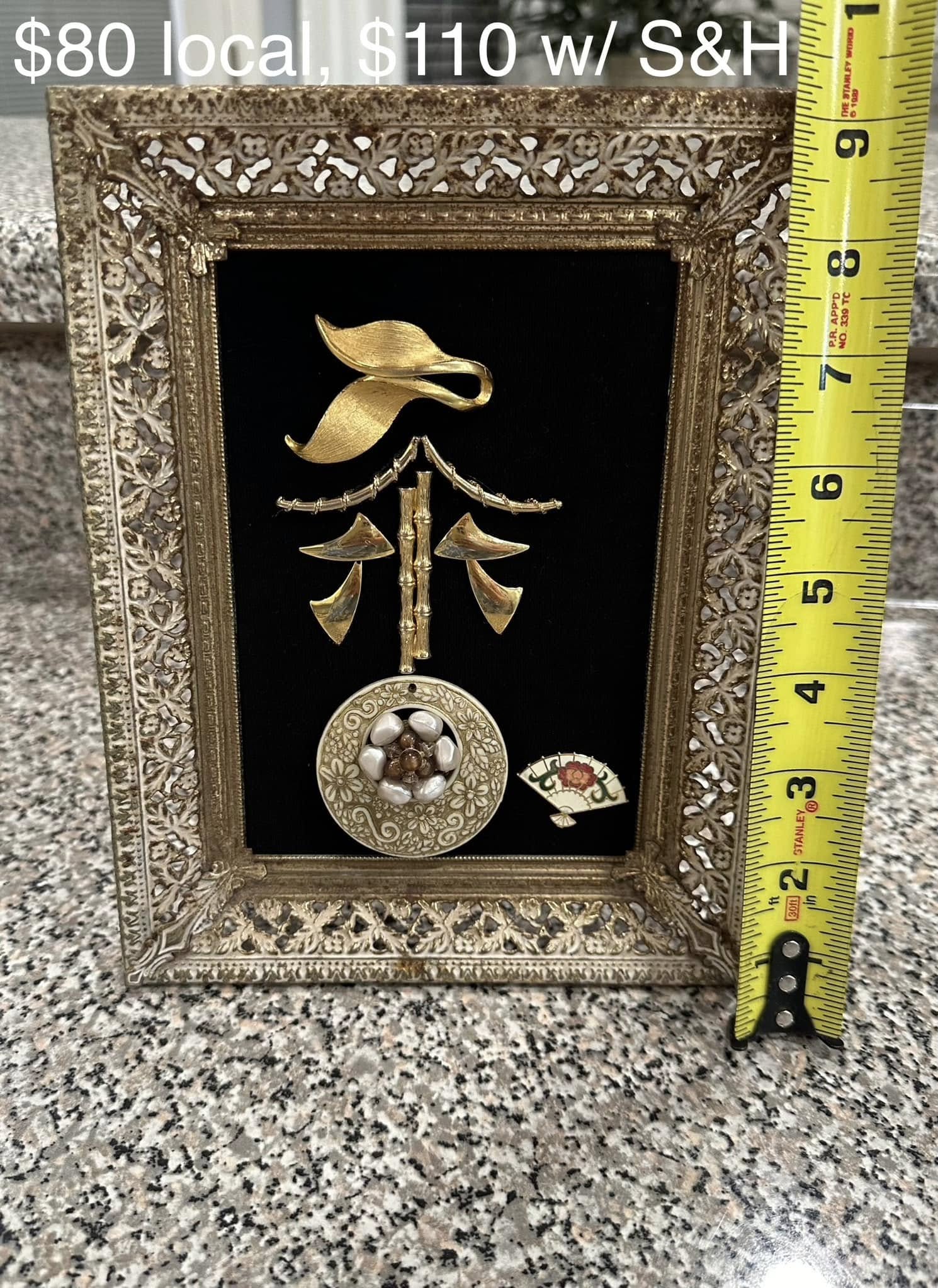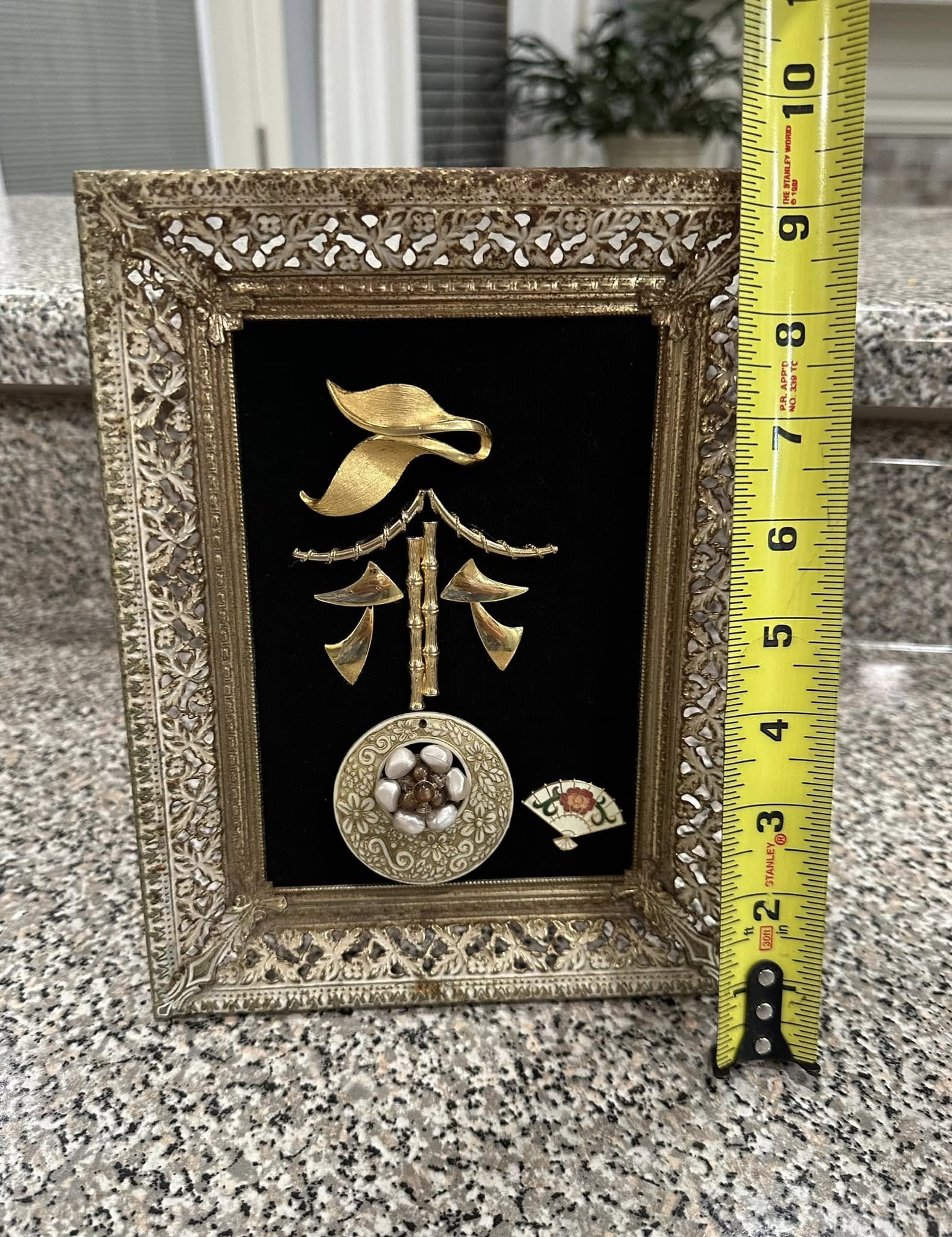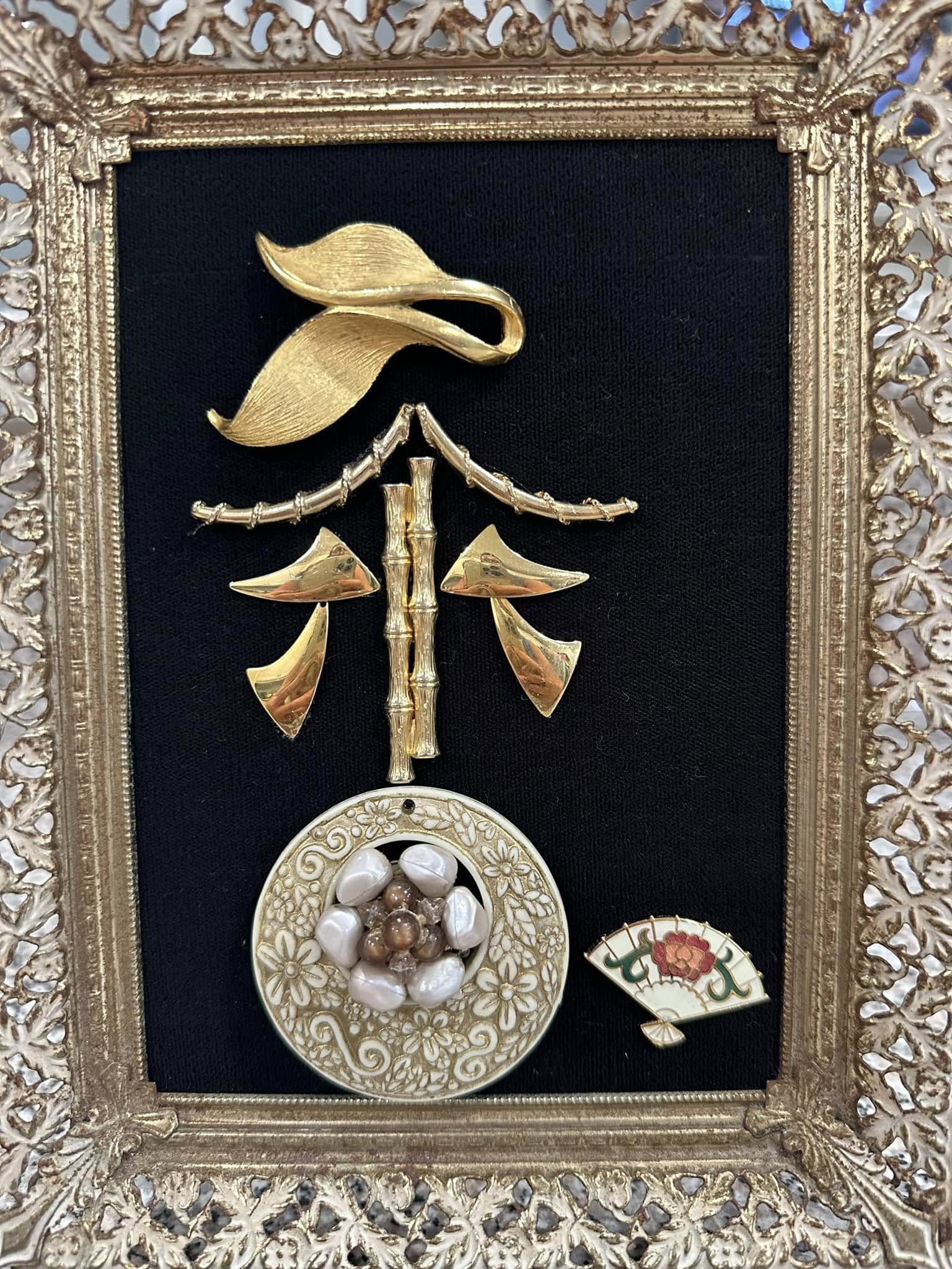 The 5x7 "Oriental" art piece presents an exquisite arrangement of vintage jewelry on a velvet background, housed within an antique decorative frame. This composition highlights intricate craftsmanship and timeless elegance, making it a distinguished addition to any curated collection or interior setting.