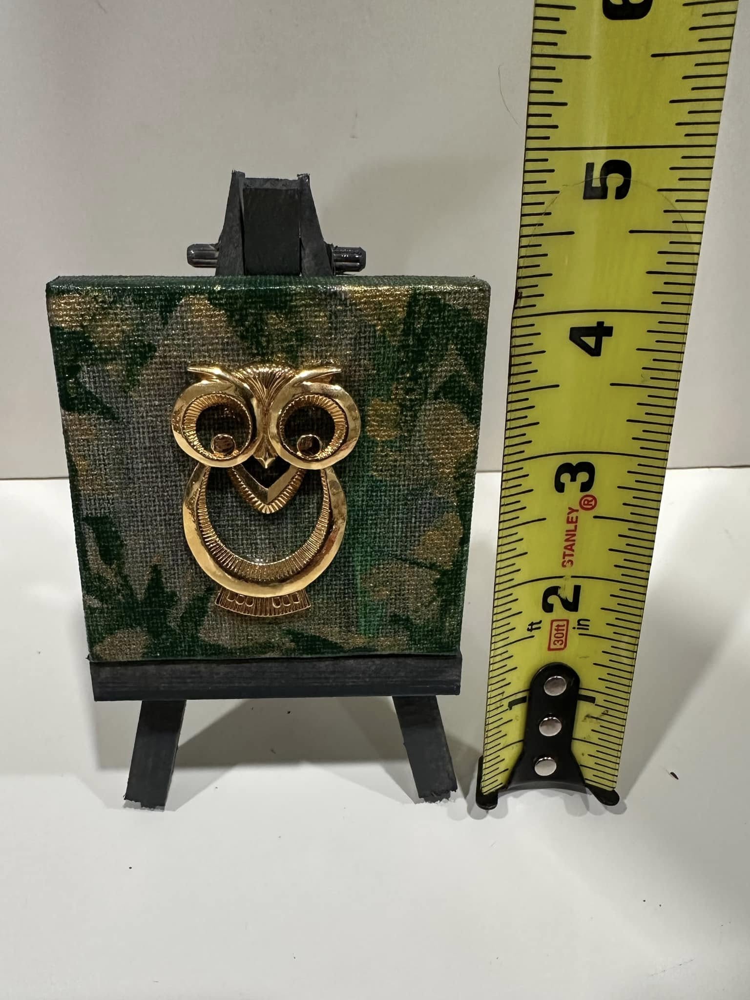This charming decorative owl jewelry piece measuring 2.5" x 2.5" features a striking composition of rich green and gold tones and placed on a mini-easel. Perfect for collectors who appreciate an owl design which represents mystery and wisdom and brings a touch of nature-inspired artistry to any shelf, desk, vanity, end table, kitchen or bathroom counter, etc. It's a nice affordable gift for yourself, a family member, a friend, or coworker.