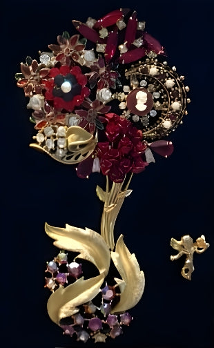"Pasion Rojo" is a vintage jewelry art piece crafted from red and gold jewelry elements set against a black background. The vibrant red tones paired with rich gold highlights create a captivating contrast that emphasizes the piece’s intricate design, timeless elegance, and is a passionate statement for collectors who appreciate refined vintage craftsmanship.