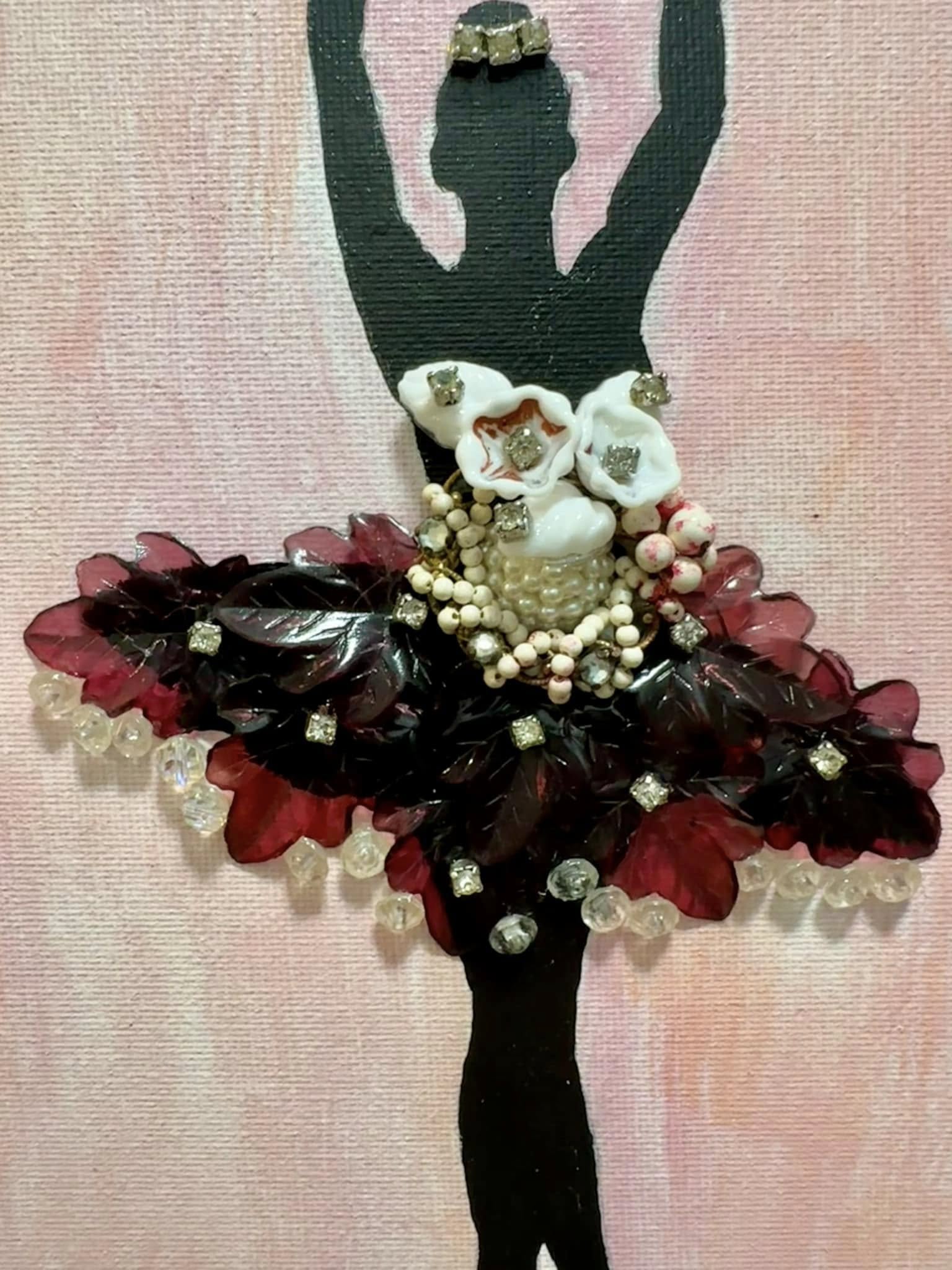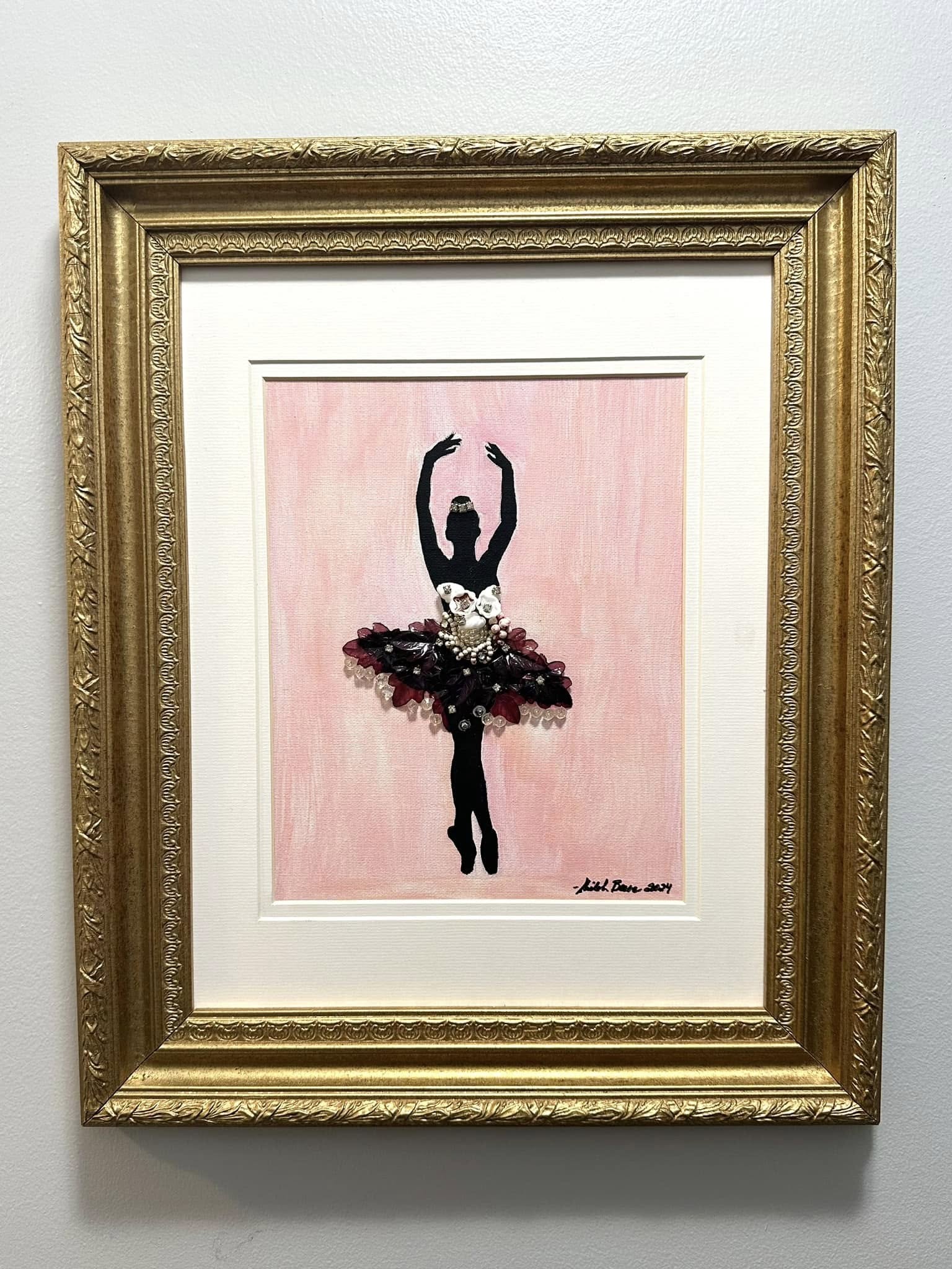 The 11x14 "Pink Ballerina" art piece features an elegant silhouette of a ballerina adorned with intricate floral details crafted from vintage jewelry. Set against a soft pink background and encased in a gold frame, this work combines delicate artistry with classic sophistication, making it a refined statement for any art collection.