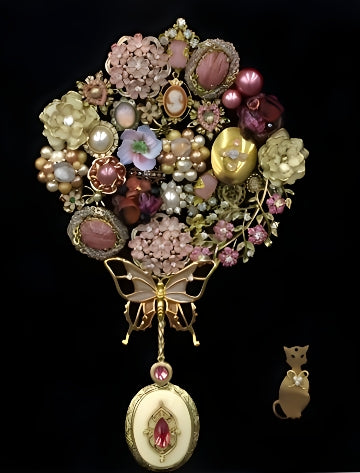 "Pretty in Pink" is a vintage jewelry art piece featuring an elegant composition of jewelry in soft creams and delicate pinks set against a black background. The gentle color palette enhances the intricate detailing and craftsmanship, creating a refined and timeless aesthetic.