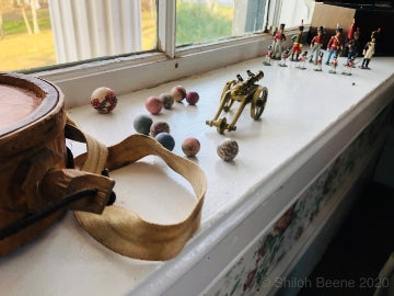 "Southern Charm 3, Rosemont 1" depicts a carefully arranged collection of toy soldiers, a cannon, marbles, and a canteen displayed on a windowsill, framed by a scenic outdoor view at Rosemont mansion. The composition evokes a sense of nostalgia and historical playfulness while emphasizing craftsmanship and detail.