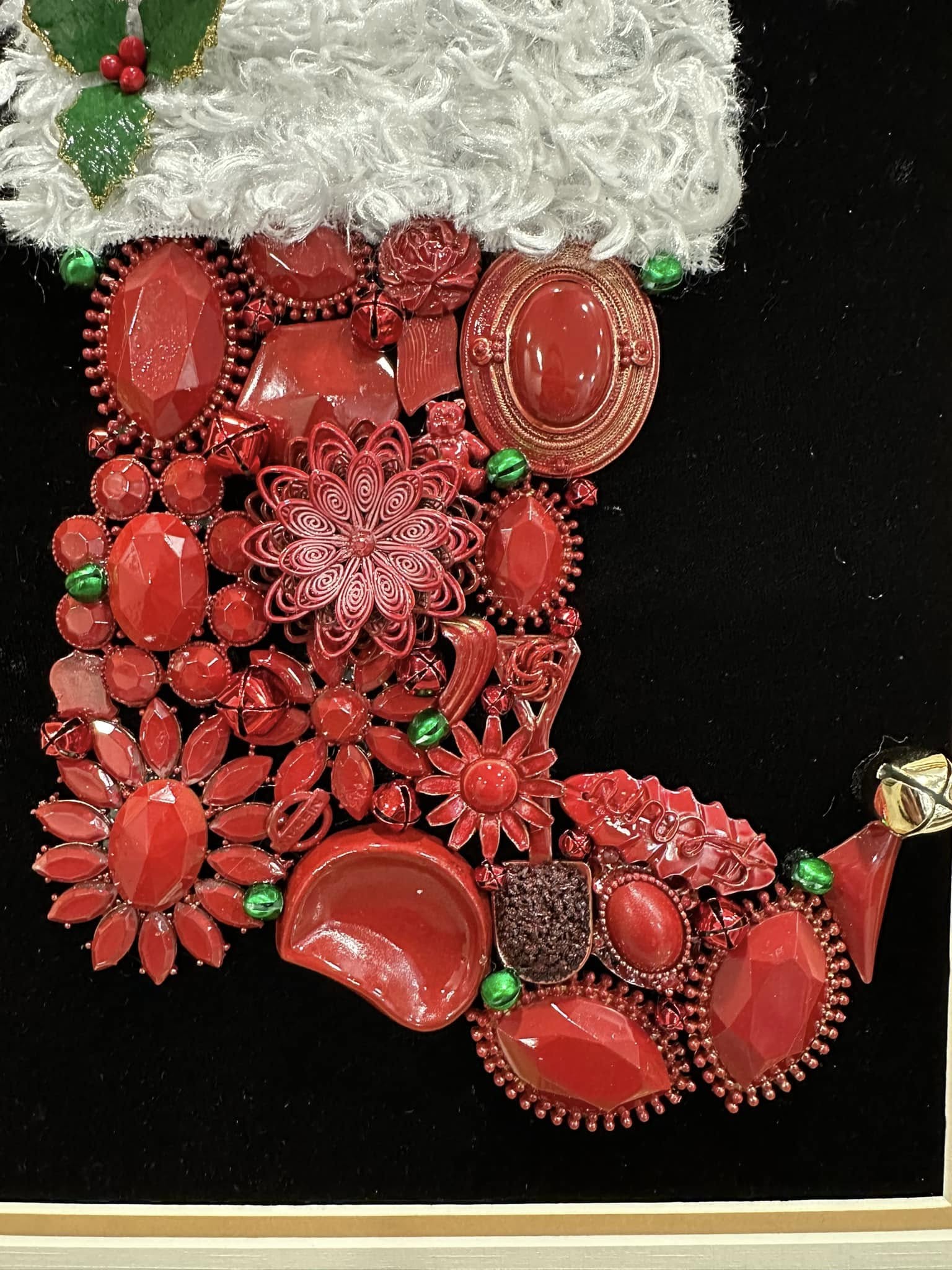 This 11x14 decorative "Christmas stocking" combines festive red and white hues made of vintage jewelry, all elegantly showcased within an ornate gold frame. Its unique craftsmanship offers a sophisticated holiday décor piece that highlights timeless charm and intricate detail, perfect for adding an expert touch to your seasonal display.