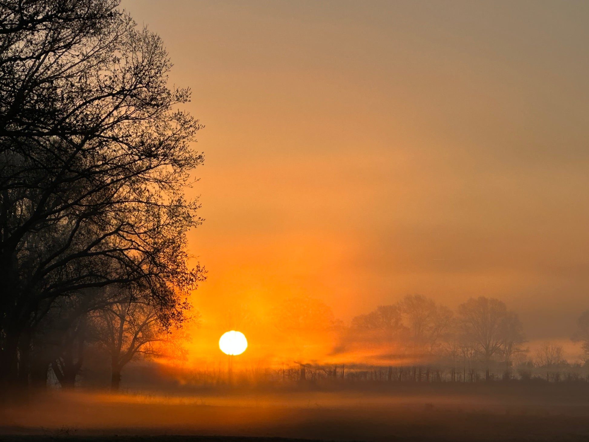 This image portrays the silhouette of trees emerging through dense fog at sunrise, where soft, diffused light gently defines their forms against a muted backdrop.