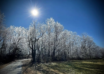 This image showcases frosted trees encrusted with ice, illuminated by bright sunlight against a clear blue sky. The crisp clarity highlights the intricate ice formations on the branches, illustrating the interaction between cold weather phenomena and sunlight.