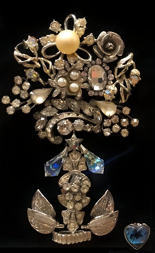 "Tropical Art Deco" is a vintage jewelry art piece featuring silver and crystal jewelry elements arranged in an Art Deco style against a black background. The sleek silver tones and sparkling crystals create striking geometric patterns that capture the elegance and glamour of the era.